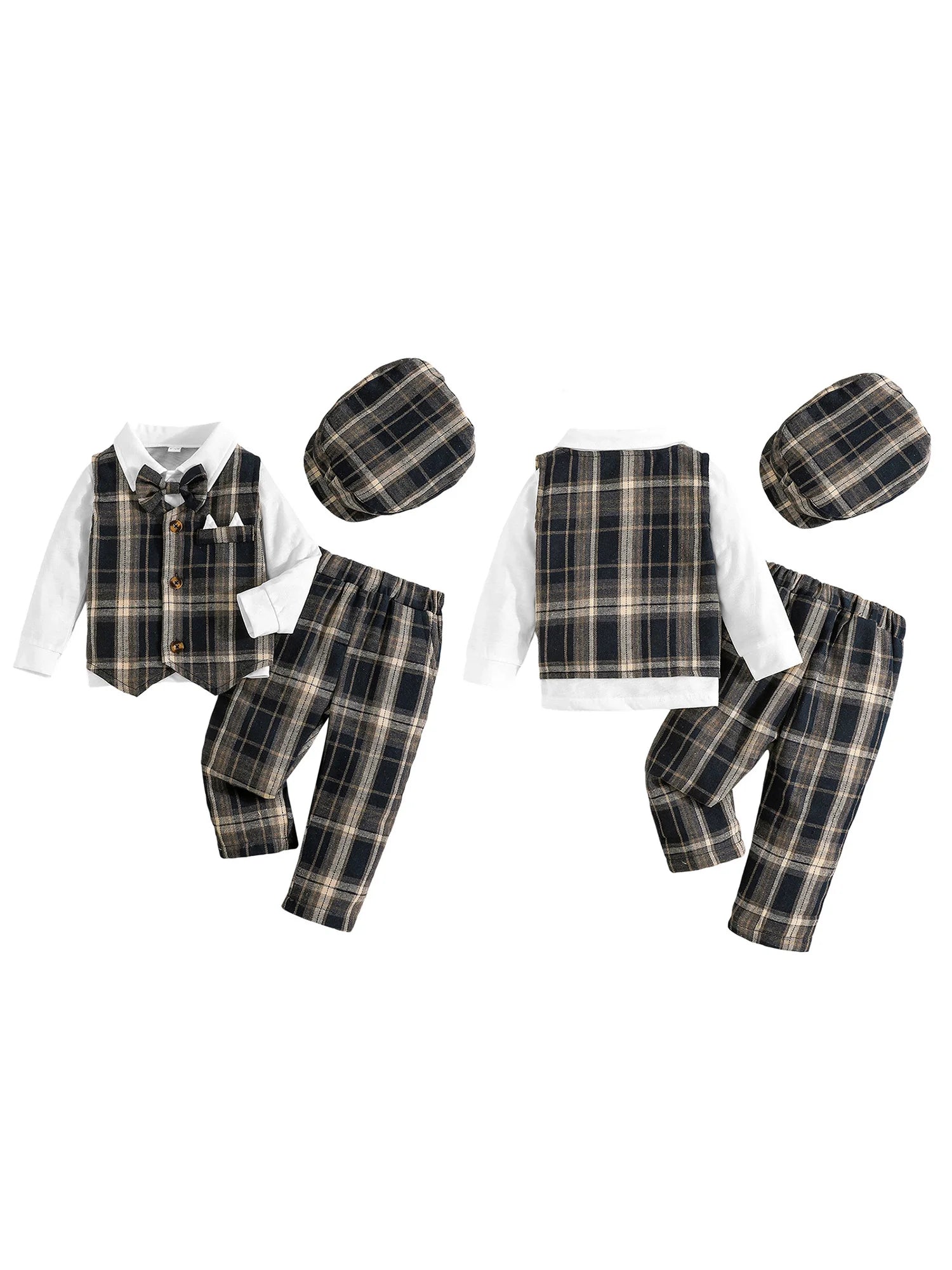 4Pcs Toddler Boy Gentleman Outfit Long Sleeve Lapel Neck Bowtie Decor Shirt with Plaid Button Down Vest Pants Hat SetSize(cm)
