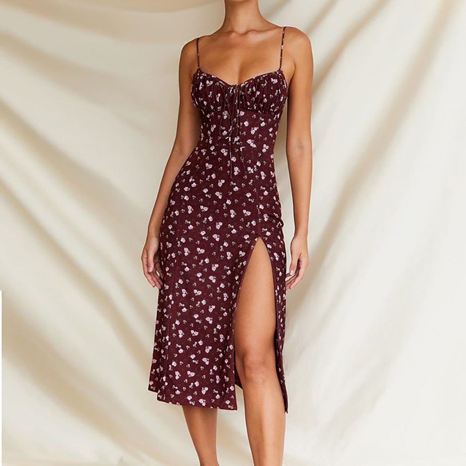 Elegant Classy Flower Print Spaghetti Straps Dresses For Women 2024 Camisole Deep V Neck Suspender Dress Woman Clothing