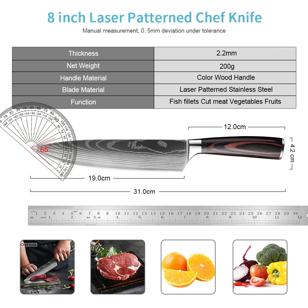 High quality 440C German Steel Kitchen Knife Damascus Laser Pattern Chef Knife Cleaver Filleting Santoku Knife Best Kitchen Tool