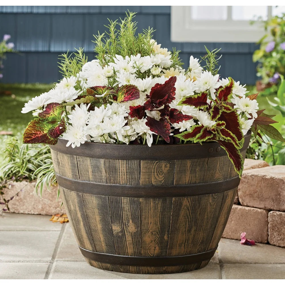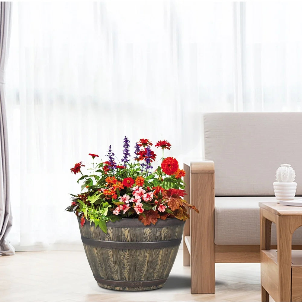 Rustic Whiskey Barrel Planter UV Resistant Brown Plastic Drainage Holes Suitable Indoor Outdoor Gardening Durable Flower Pot