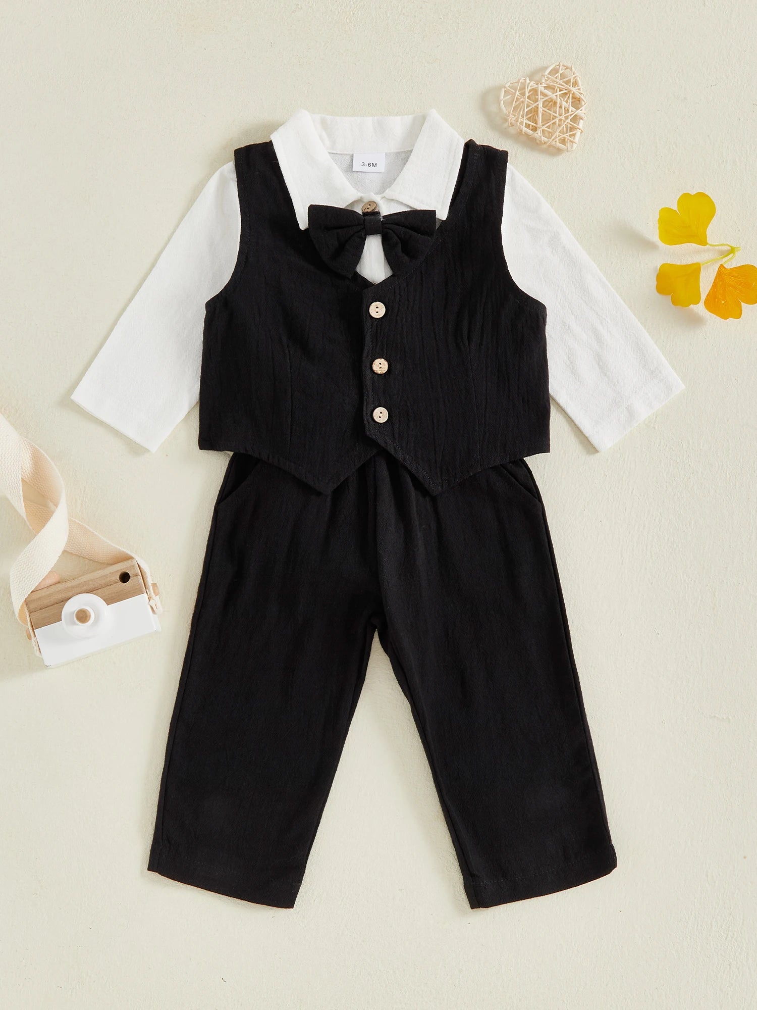 Toddler Boys Winter 4Pcs Outfit Set Long Sleeve Lapel Button Shirt Vest Suspender Pants Bowtie Sets Warm Clothes