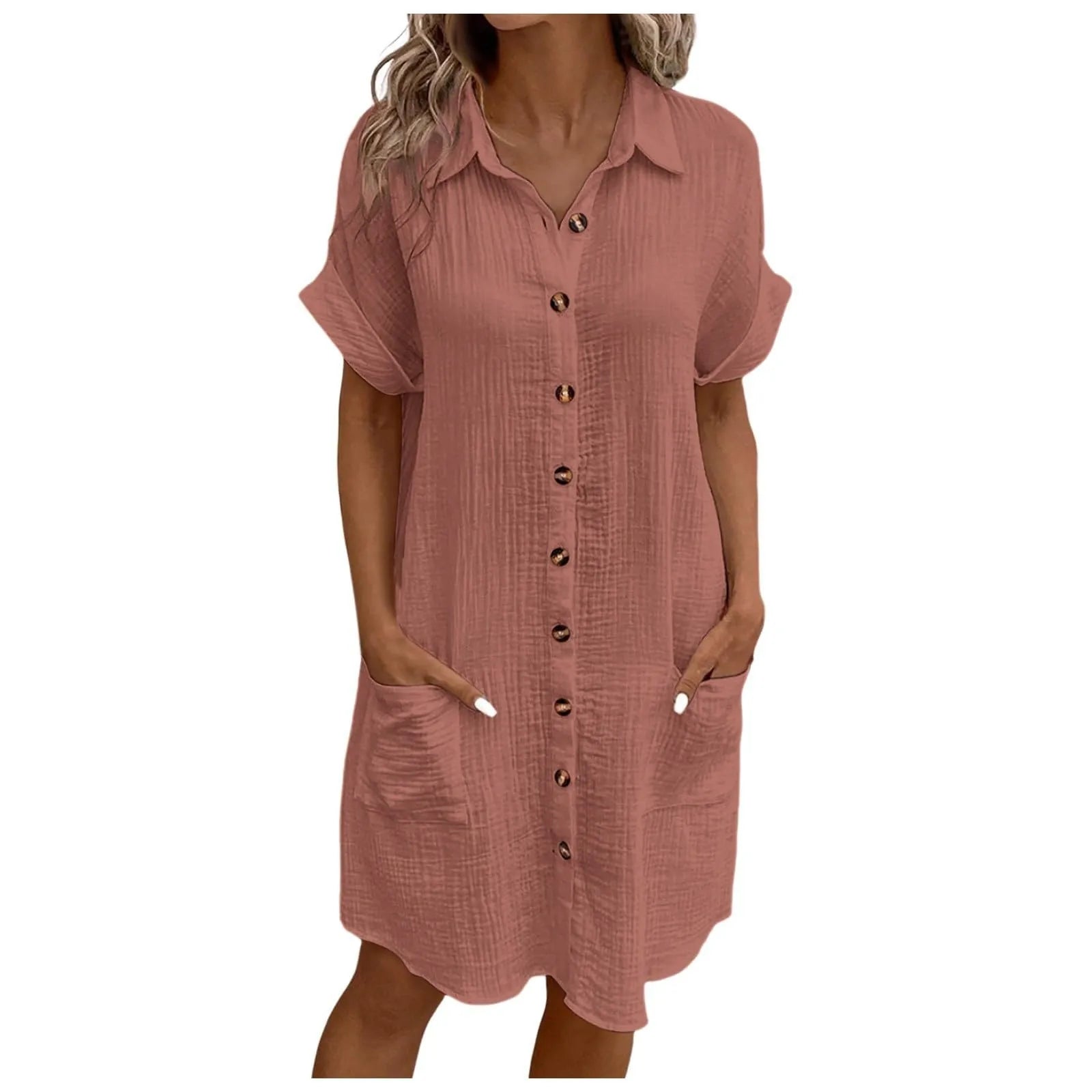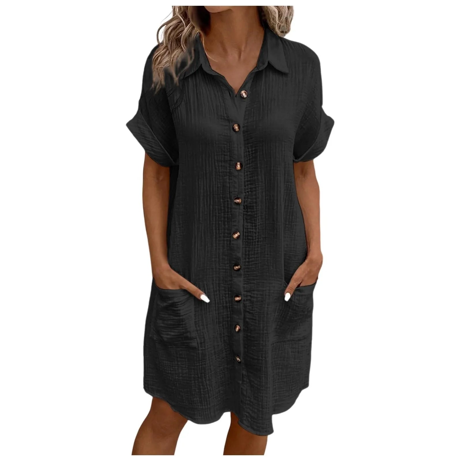 Women'S Fashion Summer Minimalist V-Neck Button Up Dress Woman Cotton Linen White Short Sleeved Pocket Casual Loose Shirt Dress