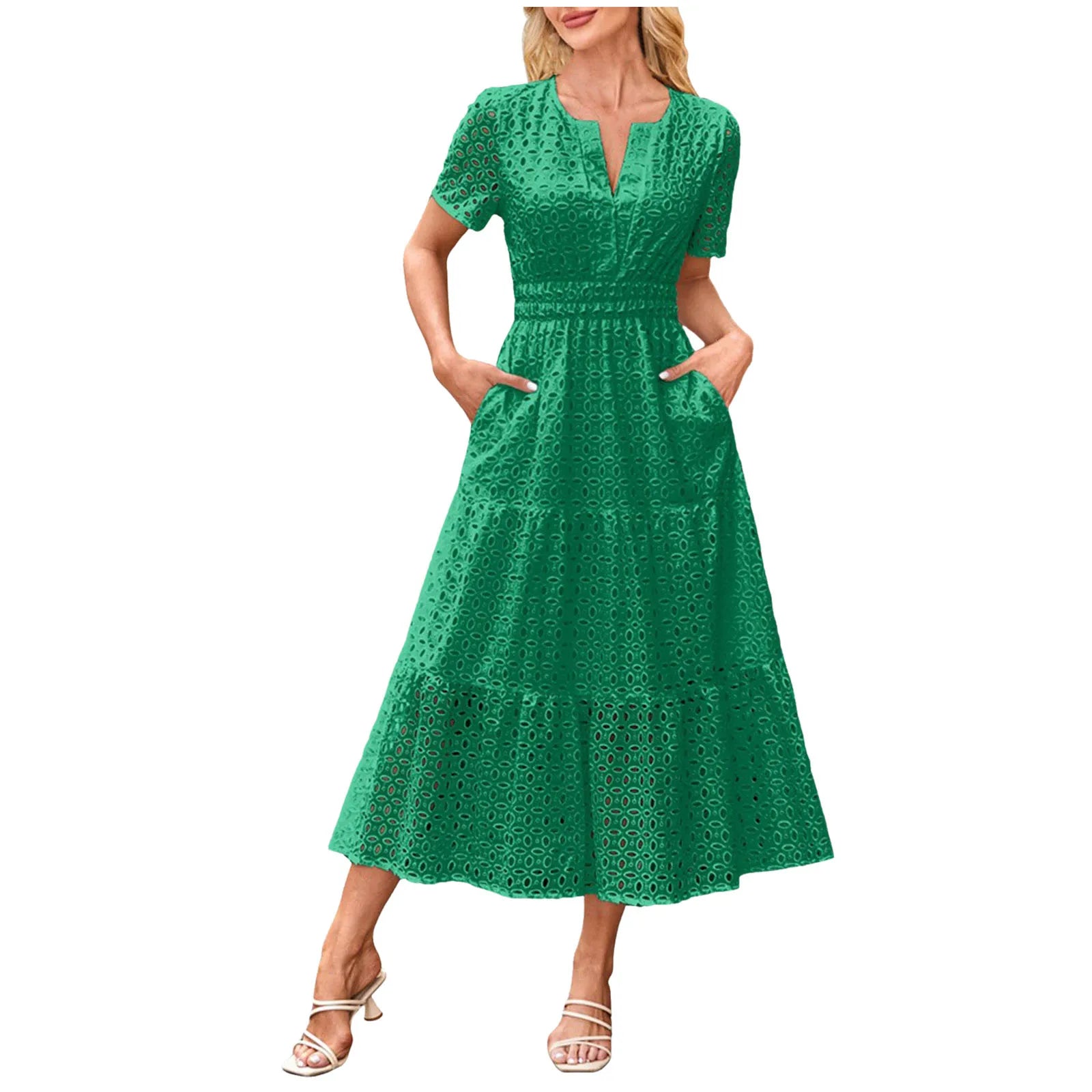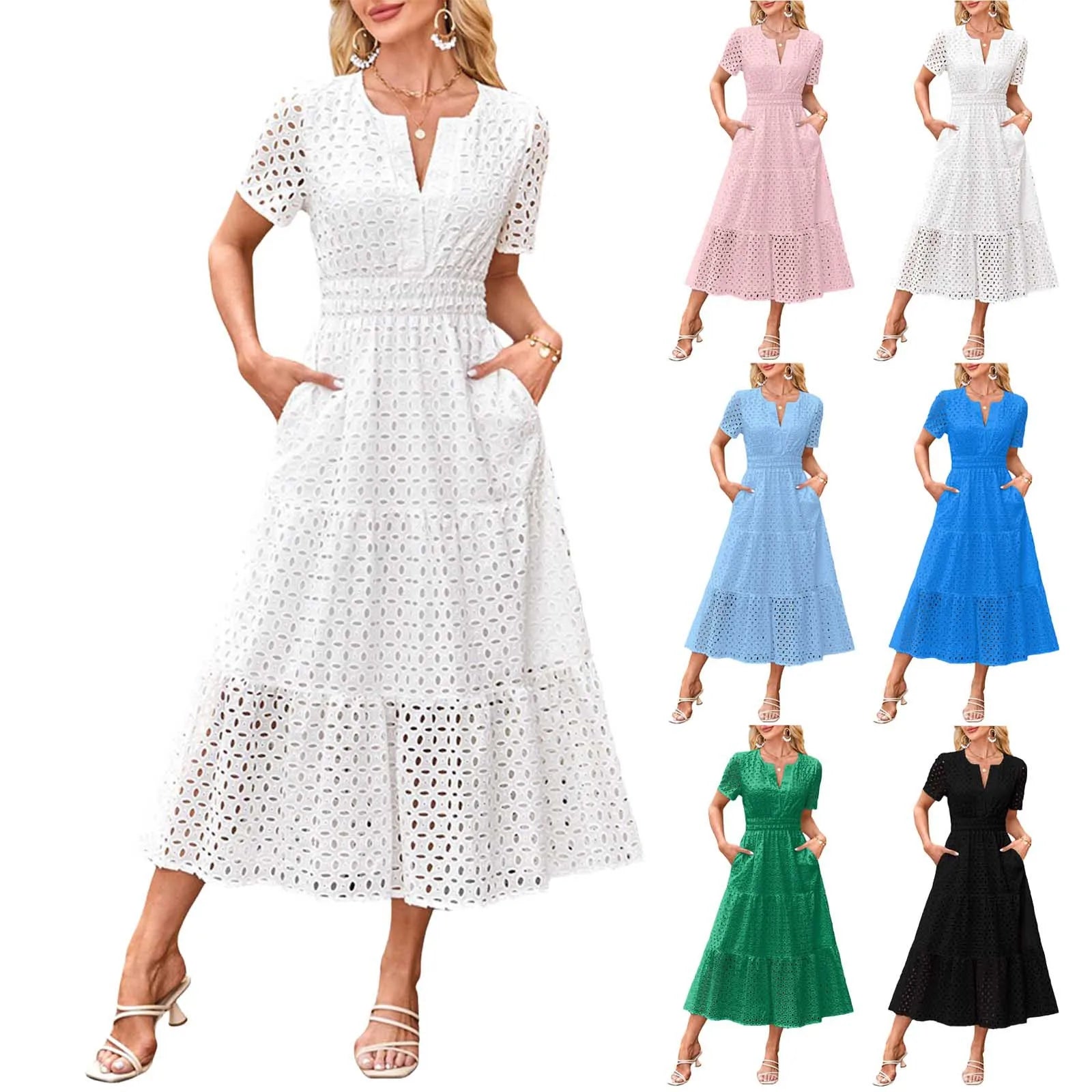 Women'S Summer Short Sleeved Long Dress Trendy V-Neck Hollow Eyelets Ruffle Hem A-Line Dress Pockets Female Temperament Dresses